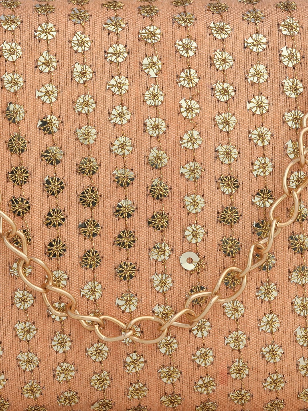 Peach & Gold Embroidered Box clutches, Has gold chain shoulder strap, 1 main compartment with Kiss closure