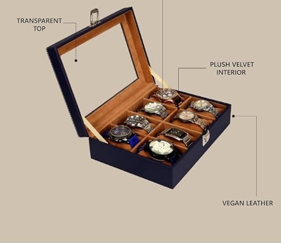Presents Luxury 12 Slot Watch Box for Men & Women Lockable Leather Watch Organizer with Glass Lid, Soft Velvet Cushions, Premium Display & Storage Case for Watches (Blue)